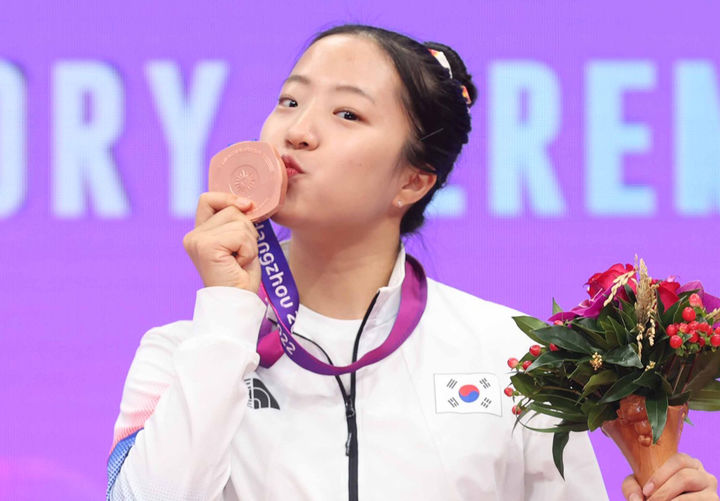 [서울=뉴시스] 조성우 기자 = 1일 중국 항저우 궁수 캐널 스포츠파크 체육관에서 열린 2022 항저우 아시안게임 탁구 여자 단식 시상식에서 신유빈이 동메달에 입을 맞추고 있다. (사진=대한탁구협회 제공) 2023.10.01. [email protected] *재판매 및 DB 금지