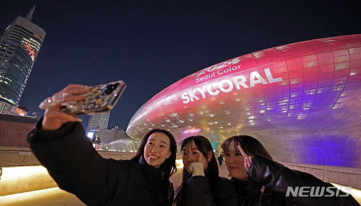 [서울=뉴시스] 김금보 기자 = 30일 오후 서울 동대문구 DDP 외벽에 '2024 서울색'으로 선정된 '스카이코랄(SkyCoral)' 색이 비치고 있다. 서울시는 이날 오전 2024 서울색으로 스카이코랄을 선정했다. 올해 서울시민이 여가 활동을 하기 위해 가장 많이 찾았던 '한강의 핑크빛 하늘'에서 추출된 색상으로, 앞으로 서울 시내 주요 랜드마크와 굿즈를 통해 만나볼 수 있게 된다. 2023.11.30. [email protected]