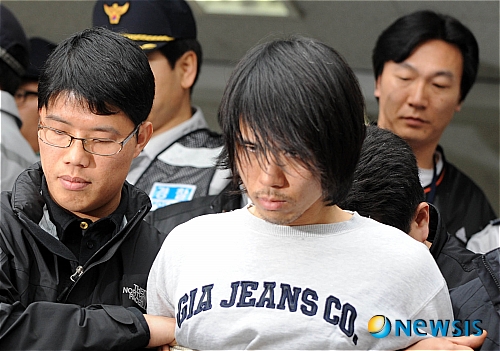 【부산=뉴시스】하경민 기자 = 부산 여중생 납치살해 피의자 검거 사흘째인 12일 오후 부산 사상경찰서에서 김길태(33)가 영장실질심사를 받기 위해 차량으로 이동하고 있다.