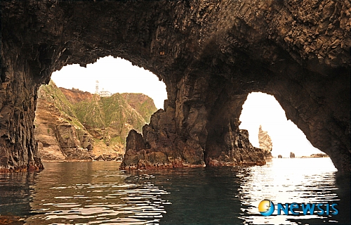 【독도=뉴시스】권주훈 기자 =독도 삼형제굴 바위 안쪽에서 본 동도와 촛대바위가 자연의 장엄함을 드러내고 있다.