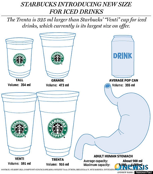 【서울=뉴시스】세계적인 커피전문 업체 스타벅스가 18일부터 31온스(약 880g)짜리 '트렌타(Trenta)' 컵 사이즈를 미국 전역에서 단계적으로 출시한다고 17일(현지시간) 밝혔다. (사진출처=미국 허핑턴 포스트 웹사이트)