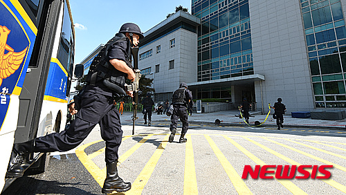 【용인=뉴시스】이정선 기자 = 2015년 도 단위 을지연습 연계 민·관·군 합동 사태수습 종합훈련이 실시된 18일 오후 경기도 용인시청에서 용인동부경찰서 대원들이 경계를 위해 차량에서 내리고 있다. 2015.08.18.