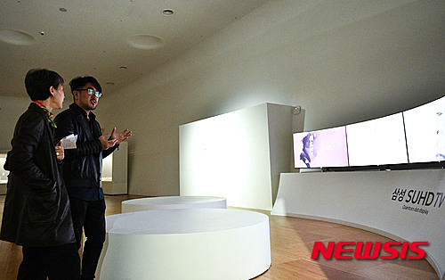 【서울=뉴시스】방지원 인턴기자 = 19일 오후 서울 동대문구 동대문디자인플라자(DDP)에서 열린 ‘간송문화전 6부:풍속인물화전-일상, 꿈 그리고 풍류’ 전시 간담회에서 구범석(오른쪽) 작가가 관람객에게 작품설명을 하고 있다. 2016.04.19.