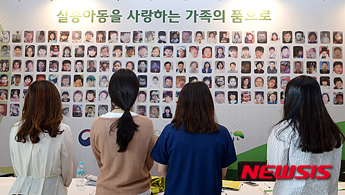 【서울=뉴시스】이영환 기자 = 세계 실종아동의 날인 25일 오후 서울 중구 페럼타워 페럼홀에서 열린 제10회 실종아동의 날 행사에 참석한 시민들이 실종아동들의 얼굴이 나와있는 현수막을 바라보고 있다. 2016.05.25.