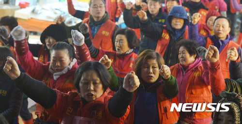 【서울=뉴시스】이영환 기자 = 5일 오전 서울 동작구 노량진수산시장 구시장에서 열린 신축건물 이전 반대집회에 참가한 현대화비상대책총연합회 소속 상인들이 구호를 외치고 있다. 2017.01.05.