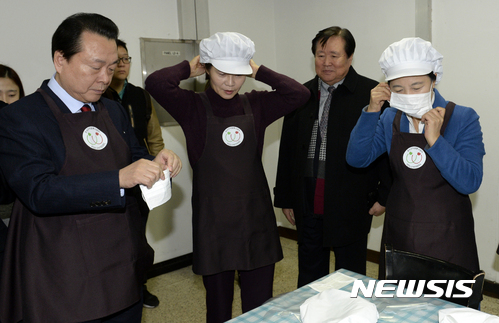 【서울=뉴시스】최진석 기자 = 추미애(오른쪽) 더불어민주당 대표가 5일 오전 서울 강서구 가양동 가양7종합사회복지관을 찾아 어르신들께 점심 배식봉사에 앞서 한정애(오른쪽 세 번째) 더불어민주당 의원, 노현송(왼쪽) 강서구청장과 위생 용품을 착용하고 있다. 2017.01.05.