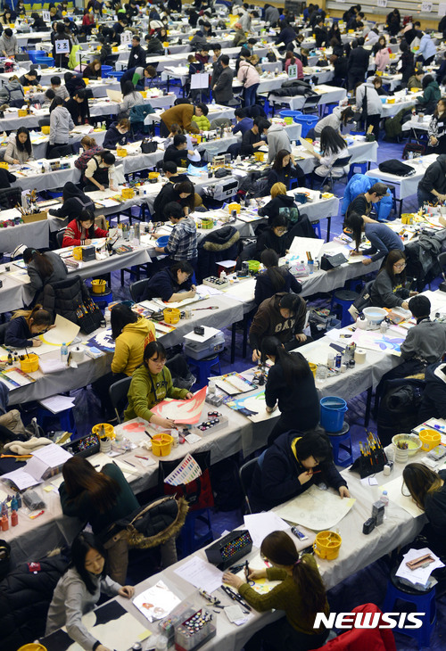 【서울=뉴시스】최동준 기자 = 11일 오전 서울 노원구 삼육대학교 체육관에서 2017학년도 정시모집 아트앤디자인학과에 지원한 수험생들이 미술 실기고사를 치르고 있다. 2017.01.11.