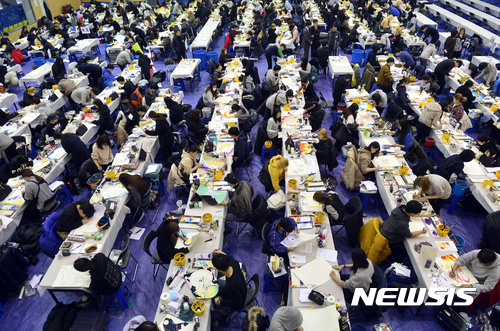 【서울=뉴시스】최동준 기자 = 11일 오전 서울 노원구 삼육대학교 체육관에서 2017학년도 정시모집 아트앤디자인학과에 지원한 수험생들이 미술 실기고사를 치르고 있다. 2017.01.11.