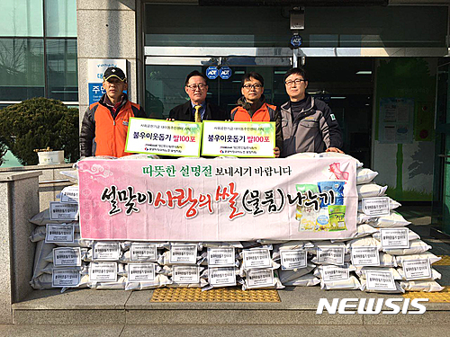【포항=뉴시스】강진구 기자 = 경북 포항시 음식물류폐기물 처리업체인 영산만산업(주)(대표 신대식)과 영산만산업 직원들로 구성된 공공비정규직노동조합포항지회(지회장 박용규)는 12일 오후 대이동주민센터에 관내 소외계층에게 전달해 달라며 사회공헌기금으로 마련한 쌀 20㎏,200포대(400만원 상당)를 기증했다.2017.01.12.(사진=공공비정규직노동조합포항지회 제공)