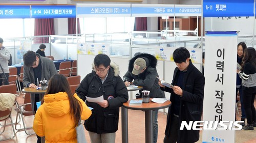 【서울=뉴시스】20일 오후 서울시 동작구 노량진동 동작구청 대강당에서 열린 '2017 청년인턴 채용박람회'를 찾은 청년 인턴 구직자들이 이력서를 작성하고 있다. 2017.01.20. (사진=동작구 제공)