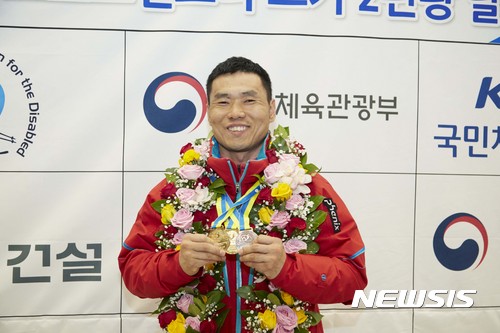 【서울=뉴시스】2017 리비프 파라노르딕스키 월드컵에서 2관왕을 달성한 신의현이 23일 인천국제공항으로 입국, 메달을 들어보이고 있다. 2017.01.24. (사진=대한장애인체육회 제공)