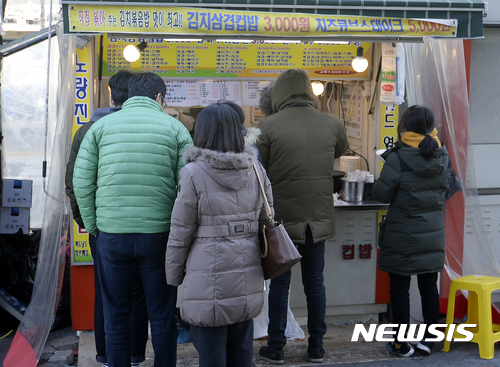 【서울=뉴시스】최진석 기자 = 설날인 28일 서울 동작구 노량진 컵밥거리 한 컵밥집에 취업준비생들과 시민들이 줄지어 컵밥을 구입하기 위해 기다리고 있다. 2017.01.28.