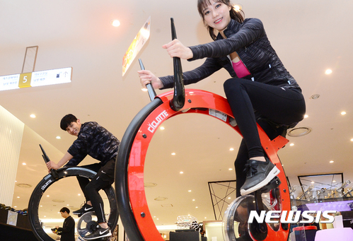 【서울=뉴시스】이종철 기자 = 롯데백화점이 15일 오전 서울 롯데백화점 강남점 복합 체험형 편집매장 '끌레'에서 프리미엄 실내용자전거 '씨클로트(CICLOTTE)'를 선보이고 있다.