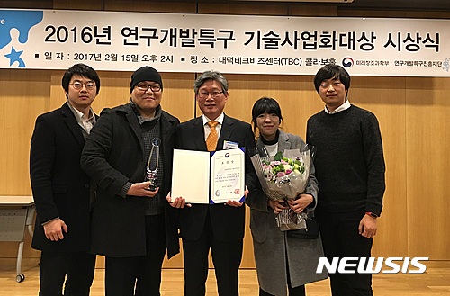 【대전=뉴시스】유순상 기자 = 한밭대기술지주㈜  관계자들이 15일 대덕테크비즈센터에서 열린 '2016년 연구개발특구진흥재단 기술사업화대상'에서 미래창조과학부 장관상을 받은뒤 기념촬영을 하고 있다. 이 회사는 지난 2014년 2월 한밭대 산학협력단이 100% 출자해 설립, 만 3년만에 18개 자회사를 만들고 14개 연구소기업을 등록시켰다.2017.02.16.(사진=한밭대 제공)