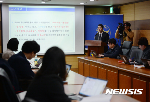 서울지방경찰청 사이버안전과는 트위터 등 SNS를 통해 자살시도자들에게 질소가스를 이용한 자살세트를 광고 후 100만원을 받고 직접 설치해 주거나, 동반자살로 유인한 여성에게 ‘저승사자’를 자처하며 성추행한 자살브로커 A(55세, 남) 등 2명을 구속했다. 2017.03.03.