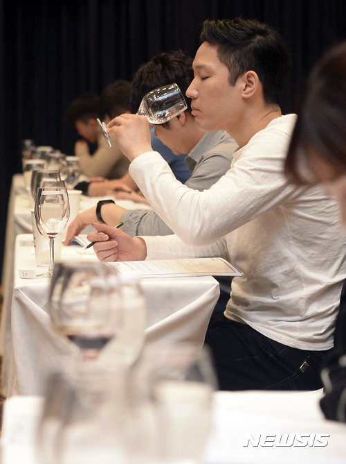 【서울=뉴시스】최진석 기자 = 21일 오전 서울 중구 밀레니엄 서울힐튼 그랜드볼룸에서 열린 '제16회 한국 소믈리에 대회 1차 예선' 참가자들이 시험 문제로 나온 와인을 테이스팅하고 있다. 2017.03.21.
