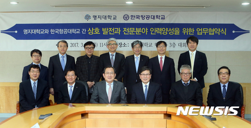 【서울=뉴시스】명지대학교(총장 유병진)는 한국항공대학교(총장 이강웅)와 23일 서울 서대문구 인문캠퍼스 행정동 대회의실에서 공동 이익 및 발전과 전문분야 인력 양성을 목표로 업무협약을 체결했다.
