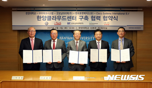 【서울=뉴시스】김진아 기자 = 4일 서울 서울 성동구 한양대학교에서 이주찬(왼쪽부터) 굿모닝아이텍 대표이사, 조범구 시스코코리아 대표이사, 이영무 한양대 총장, 정명철 이테크시스템 회장, 함기호 한국휴렛팩커드 엔터프라이즈 대표이사가 한양클라우드센터 구축 협약을 체결한 뒤 기념 촬영하고 있다. 2017.04.04. (사진=한양대학교 제공)