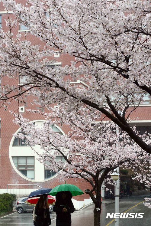【부산=뉴시스】 하경민 기자= 봄비가 내린 5일 오전 부산 사상구 신라대에서 벚꽃이 활짝 핀 가운데 학생들이 우산을 쓰고 걷고 있다. 2017.04.05.