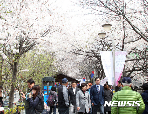 【서울=뉴시스】제6회 신대방 어울림 벚꽃 축제가 열리고 있는 8일 오후 서울시 동작구 신대방동 도림천에서 많은 구민들이 꽃을 보며 여유로운 시간을 보내고 있다. 2017.04.08. (사진=동작구 제공)