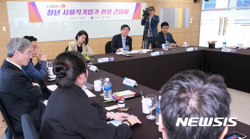 【서울=뉴시스】추상철기자= 이기권 고용노동부장관이 12일 서울 성동구 위치한 사회적기업 성장지원센터인 '소셜캠퍼스 온 서울' 개소식에서 청년 사회적기업가 현장 간담회를 갖고 있다. 2017.04.12. (사진=고용노동부 제공)