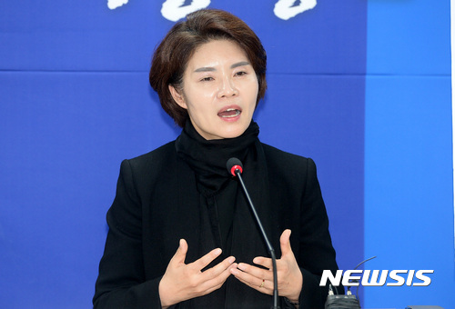 【서울=뉴시스】이영환 기자 = 문재인 더불어민주당 대선후보 선거대책위원회 한정애 홍보본부장이 16일 오후 서울 여의도 더불어민주당 대회의실에서 선거홍보물 관련 기자간담회를 하고 있다. 2017.04.16.