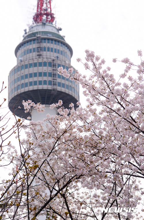 【서울=뉴시스】김선웅 기자 = 포근한 봄 날씨를 보인 16일 서울 중구 남산공원에 만개한 벚꽃이 가득하다. 2017.04.16.