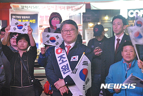 【구미=뉴시스】박홍식 기자 = 새누리당 조원진 대선 후보가 18일 오후 경북 구미역 유세에 앞서 '박근혜 전 대통령 탄핵무효' 홍보 영상을 보고 있다. 2017.04.18
