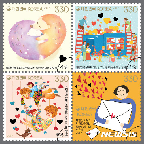 【서울=뉴시스】우정사업본부가 2016년 우표디자인 공모대전 청소년, 일반부문 대상 수상작을 담은 기념우표 4종, 총 64만장을 오는 2일 발행한다고 1일 밝혔다. 우표는 '사랑'과 '행복' 두 가지 주제를 표현하고 있다.