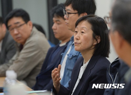【서울=뉴시스】강종민 기자 = 안철수 국민의당 대선후보의 부인 김미경 교수가 2일 오후 서울 중랑구 신내동 서울주택도시공사 북부주거복지단 동대문센터에서 SH 직원, 사회적기업 관계자들과 간담회를 갖고 있다. 2017.05.02.