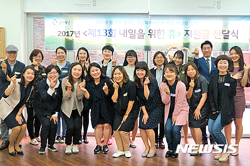 【아산=뉴시스】이종익 기자 = 충남 아산의 중부도시가스㈜는 사회복지법인 중부재단에 사회복지사들에게 쉼과 회복의 기회를 제공하기 위한 '내일을 위한 휴' 지원금 3000만원을 전달했다고 17일 밝혔다. 천안과 아산 등의 지역에서 올해 지원 대상자로 선정된 19명의 사회복지사들이 기념촬영을 하고 있다. 2017.05.17. (사진=중부도시가스 제공)