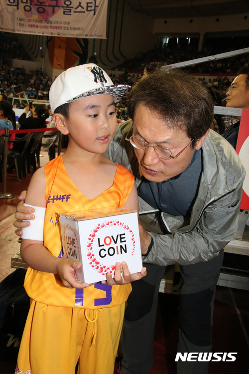 【서울=뉴시스】최동준 기자 = 조희연 서울시교육감이 21일 오후 서울 송파구 잠실 학생체육관에서 열린 '2017 심장병어린이돕기 희망농구 올스타'에 참석, 어린아이와 대화를 하고 있다. 2017.05.21. (사진=서울시교육청 제공)