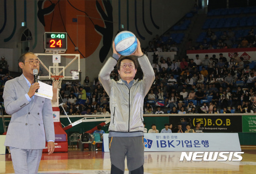 【서울=뉴시스】최동준 기자 = 조희연 서울시교육감이 21일 오후 서울 송파구 잠실 학생체육관에서 열린 '2017 심장병어린이돕기 희망농구 올스타'에 참석, 시구를 하고 있다. 2017.05.21. (사진=서울시교육청 제공)