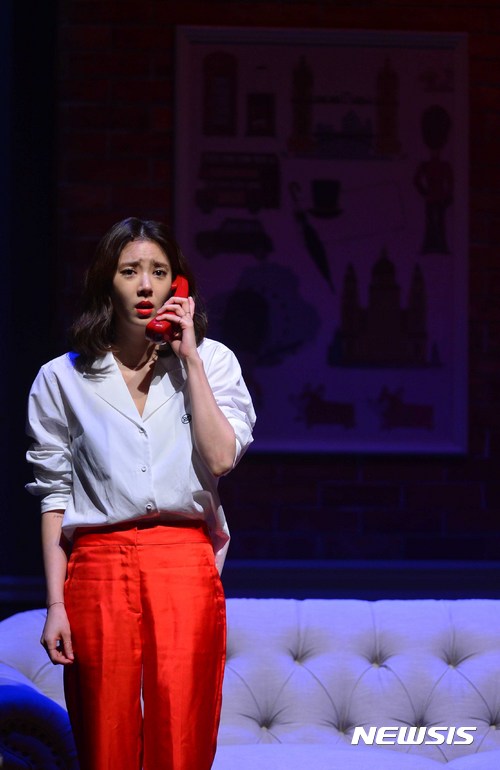 【서울=뉴시스】고승민 기자 = 22일 오후 서울 동숭아트센터에서 열린 연극 '라이어' 20주년 기념 연극 '스페셜 라이어' 프레스콜에서 '바바라 스미스' 역의 손담비가 열연하고 있다.