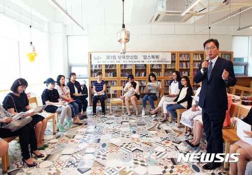 【서울=뉴시스】이창우 동작구청장이 24일 서울 동작구 흑석동 주민센터 맘스하트 카페에서 어린이집 학부모를 대상으로 제1회 보육반상회 '맘스톡톡'을 개최하고 인사말을 하고 있다. 2017.05.24. (사진=동작구 제공)