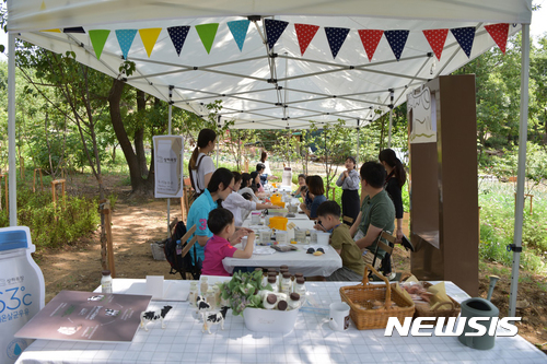 【서울=뉴시스】매일유업 상하목장이 2일 서울 송파구 오금동 참다숲에서 '오가닉 서클 가드닝 클래스'를 개최한 가운데 어린이들이 요구르트 공병을 이용해 만든 업사이클링 화분을 꾸미고 있다. 2017.06.02. (사진=매일유업 제공)