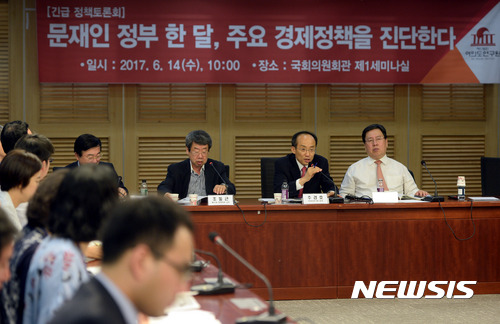 【서울=뉴시스】임태훈 기자 = 14일 오전 서울 여의도 국회 의원회관 제1세미나실에서 '문재인 정부 한 달, 주요 경제정책을 진단한다'를 주제로 열린 여의도연구원 정책세미나에서 추경호 자유한국당 의원 겸 여의도연구원장이 진행을 하고 있다. 2017.06.14.