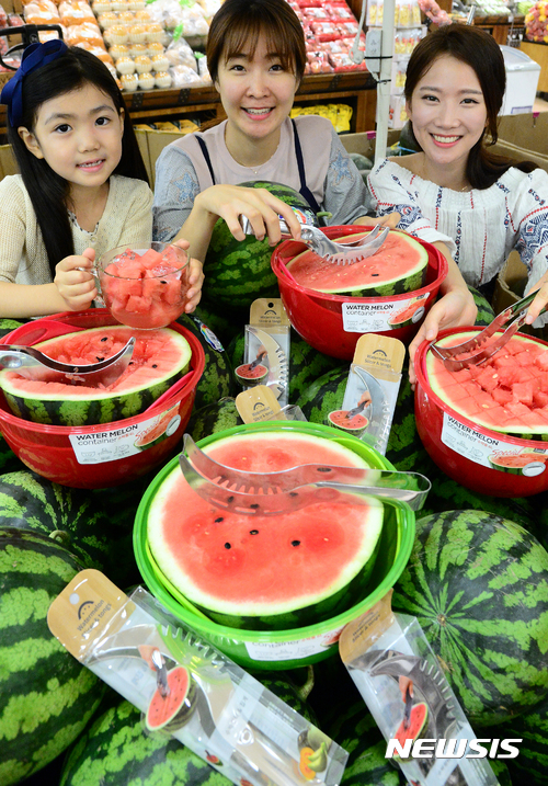 【서울=뉴시스】이종철 기자 = 19일 서울 중구 봉래동 롯데마트 서울역점에서 모델들이 칼날모양 그대로 일정하게 수박을 잘라 집게로 바로 옮겨 담을 수 있는 '수박칼'과 랩 보관 대신 수박 반 통을 담을 수 있는 '수박 전용 용기'를 선보이고 있다.? 2017.06.19.