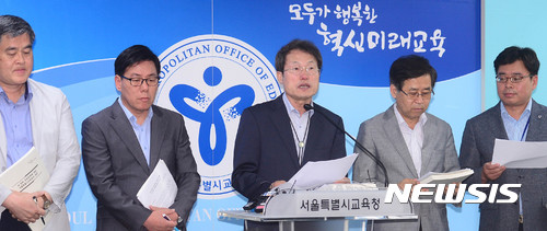 【서울=뉴시스】추상철 기자 = 조희연 서울시교육감을 비롯한 교육청 정책담당 관계자가 20일 오전 서울 종로구 서울시교육청에서 '새 정부 교육공약 이행방안 제안' 기자회견을 갖고 있다.