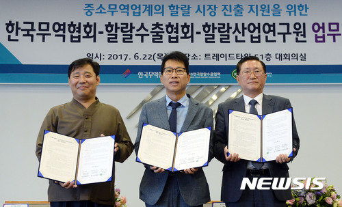 【서울=뉴시스】최동준 기자 = 22일 서울 강남구 한국무역협회에서 중소무역업계의 할랄 시장 진출 지원을 위한 한국무역협회-할랄수출협회-할랄산업연구원 업무협약식이 열렸다. 최성철(왼쪽부터) 한국할랄수출협회 회장, 김정관 한국무역협회 부회장, 장건 한국할랄산업연구원 원장이 협약식 뒤 기념촬영을 하고 있다. 2017.06.22.