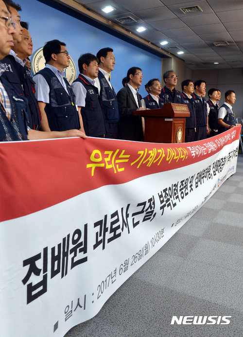 【서울=뉴시스】이영환 기자 = 더불어민주당 이용득 의원과 전국우정노동조합 관계자들이 26일 오전 서울 여의도 국회 정론관에서 '우정사업본부 인력 증원 촉구 기자회견'을 하고 있다. 2017.06.26.