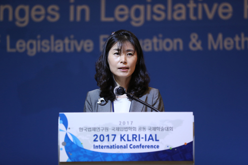 【서울=뉴시스】 28일 서울 서초구 JW 메리어트 호텔 그랜드 볼룸에서 열린 한국법제연구원-국제입법학회 공동 국제학술대회에 참석한 김외숙 법제처장이 축사를 하고 있다. 2017.06.28. (사진=한국법제연구원 제공)