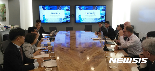 【서울=뉴시스】 28일 미국 네브라스카 주에 위치한 네브라스카 이노베이션 캠퍼스 회의실에서 농협창조농업지원센터와 농업기술실용화재단의 창업보육 실무자, 네브라스카-링컨대학 로니 그린(Ronnie Green)총장, (주)파미니티 등 미국 진출 기업체 관계자가 참석한 가운데 개최된 농협창조농업지원센터 주관 농식품 아이디어 공모전 대상을 수상한 파미니티의 미국 진출을 위한 현지 설명회에서 참석자들이 설명을 듣고 있다.