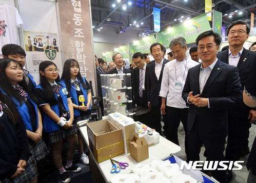 【고양=뉴시스】김선웅 기자 = 김동연 경제부총리 겸 기획재정부 장관이 30일 오후 경기 고양시 킨텍스에서 열린 제5회 협동조합의 날 및 협동조합 박람회에서 참가 학생들과 대화를 나누고 있다. 2017.06.30.