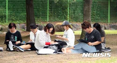 【서울=뉴시스】 30일 오후 서울 동작구 국립서울현충원에서 동작구문화원 주관으로 열린 '19회 동작구민 백일장대회'에 참가한 시민들이 나무그늘 아래서 원고지에 글을 적어내려가고 있다. 2017.06.30. (사진=동작구 제공)