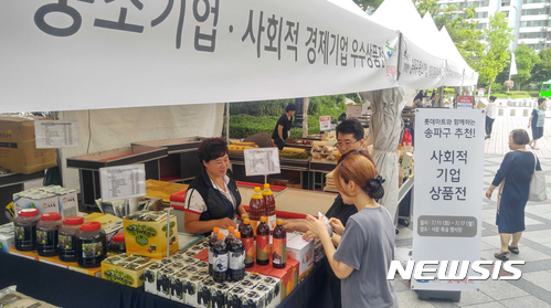 【서울=뉴시스】 11일 서울 송파구 롯데마트 잠실점 외곽 행사장에 송파구 추천의 우수중소기업과 사회적기업의 상품을 선보이는 상품전이 열리고 있다.