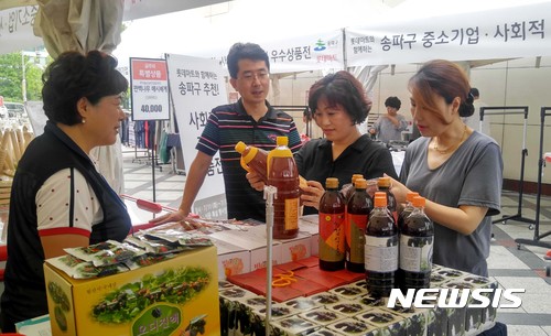 【서울=뉴시스】 11일 서울 송파구 롯데마트 잠실점 외곽 행사장에 송파구 추천의 우수중소기업과 사회적기업의 상품을 선보이는 상품전이 열리고 있다.