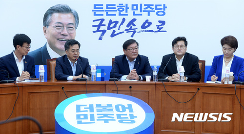 왼쪽부터 김상조 공정거래위원장, 김 부총리 겸 기획재정부 장관, 김태년 정책위의장, 홍익표 정책위수석부의장, 한정애 제5정책조정위원회 위원장. 2017.07.16.