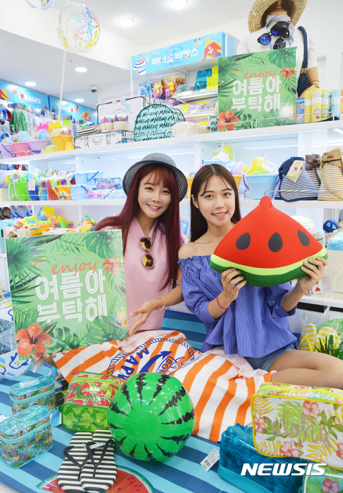 【서울=뉴시스】 18일 서울 다이소 명동역점에서 모델들이 다이소 바캉스 용품을 선보이고 있다.