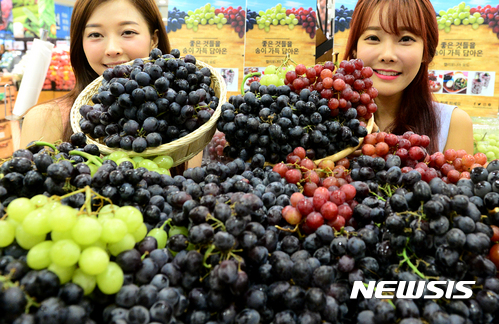 【서울=뉴시스】이종철 기자 = 21일 서울 중구 봉래동 롯데마트 서울역점에서 모델들이 미국산 고당도 블랙포도를 선보이고 있다.